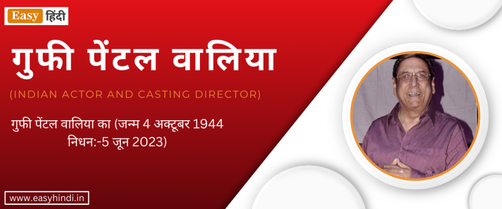 हिंदी सिनेमा और टेलीविजन के मशहूर अभिनेता गुफी पेंटल का निधन 5 जून 2023 को मुंबई में हुआ था | उन्होंने अपने करियर में कई बेहतरीन फ़िल्में और टेलीविजन सीरियल में काम किया था। उनका जन्म 4 अक्टूबर 1944 को पंजाब में हुआ था। उन्होंने प्रमुख तौर पर सुहाग”, “देश परदेस”, “घूम”, “महाभारत”, “हम पांच”, “शक्तिमान” और “ जय कन्हैया लाल जैसी फिल्मों में काम किया था। गुफी पेंटल एक मशहूर कॉमेडियन भी थे।