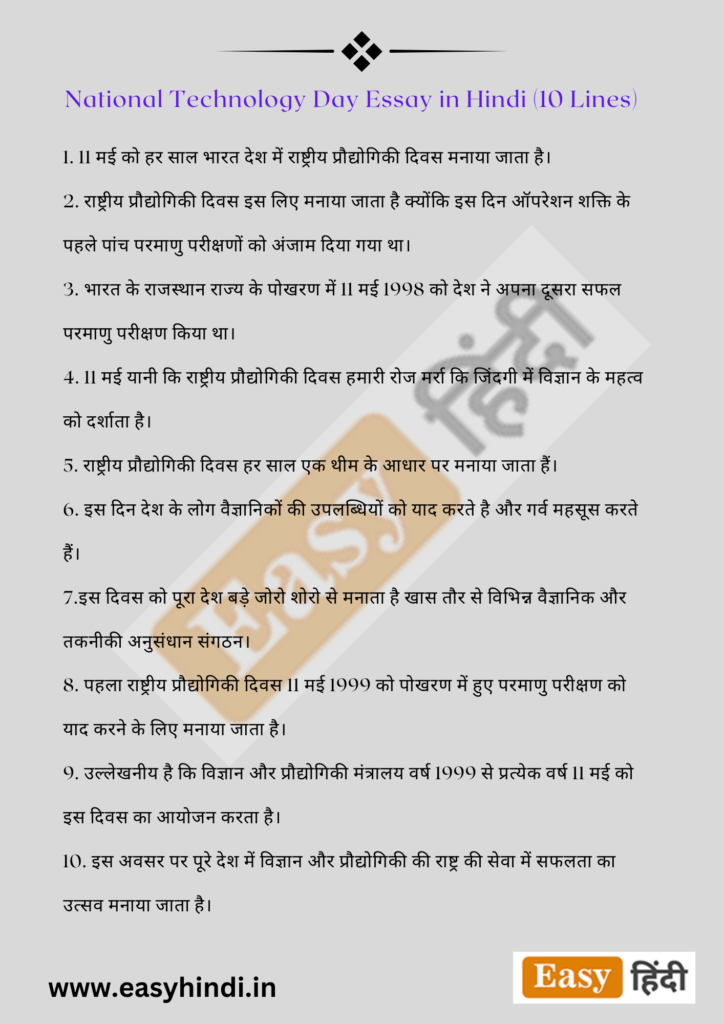 राष्ट्रीय प्रौद्योगिकी दिवस उस ऐतिहासिक दिन की याद दिलाता है, जिससे हमें अपने देश पर गर्व होता है। यह भारत की सबसे बड़ी उपलब्धियों में से एक थी, जिसने इस दिन को यादगार बना दिया। इस दिन का उद्देश्य देश की युवा तकनीकी प्रतिभाओं का सम्मान करना और उन्हें और अन्य लोगों को प्रौद्योगिकी के क्षेत्र में उत्कृष्टता प्राप्त करने के लिए प्रोत्साहित करना है। इस निबंध का हम आपको राष्ट्रीय प्रौद्योगिकी दिवस निबंध PDF उपलब्ध करा रहे है जो आप डाउनलोड कर सकते है और दोबारा कभी भी पढ़ सकते हैं।