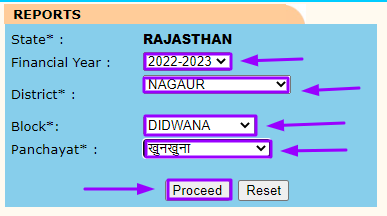 यहां पर आपको फाइनेंसियल ईयर, जिला, ब्लॉक, पंचायत का विवरण प्रस्तुत करना है तथा प्रोसीड पर क्लिक करना है।