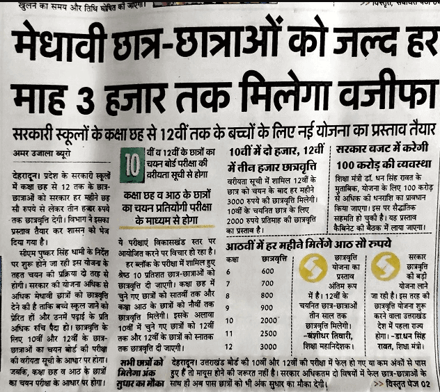 ● उत्तराखंड सरकार द्वारा हर महीने मेधावी छात्र छात्राओं को 600 से 1200 रुपए तक की छात्रवृत्ति दी जाएगी।